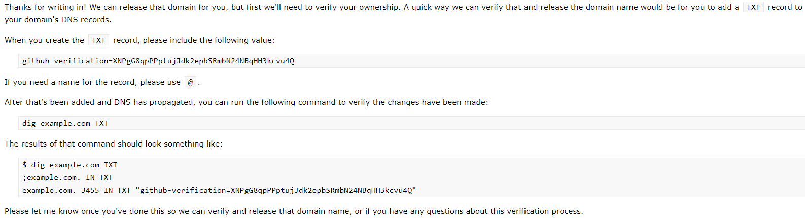 大致上的意思是需要新增一个TXT的DNS解析记录,让github support 进行验证再释放绑定的域名。