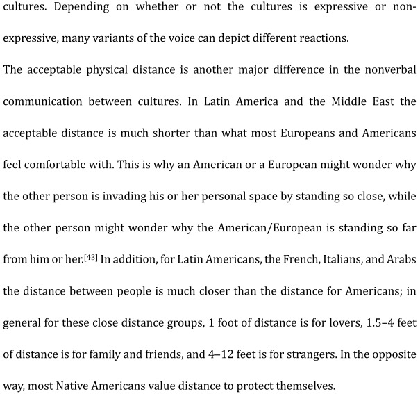 intimate(touching to 18 inches) distance || familiar, closeness and trustpersonal(18 inches to 4 feet) distance || still close, the most comfortablesocial(4 to 12 feet) distance || business and classroompublic(more than 12 feet) distance || two-way communication is not desirable or possible